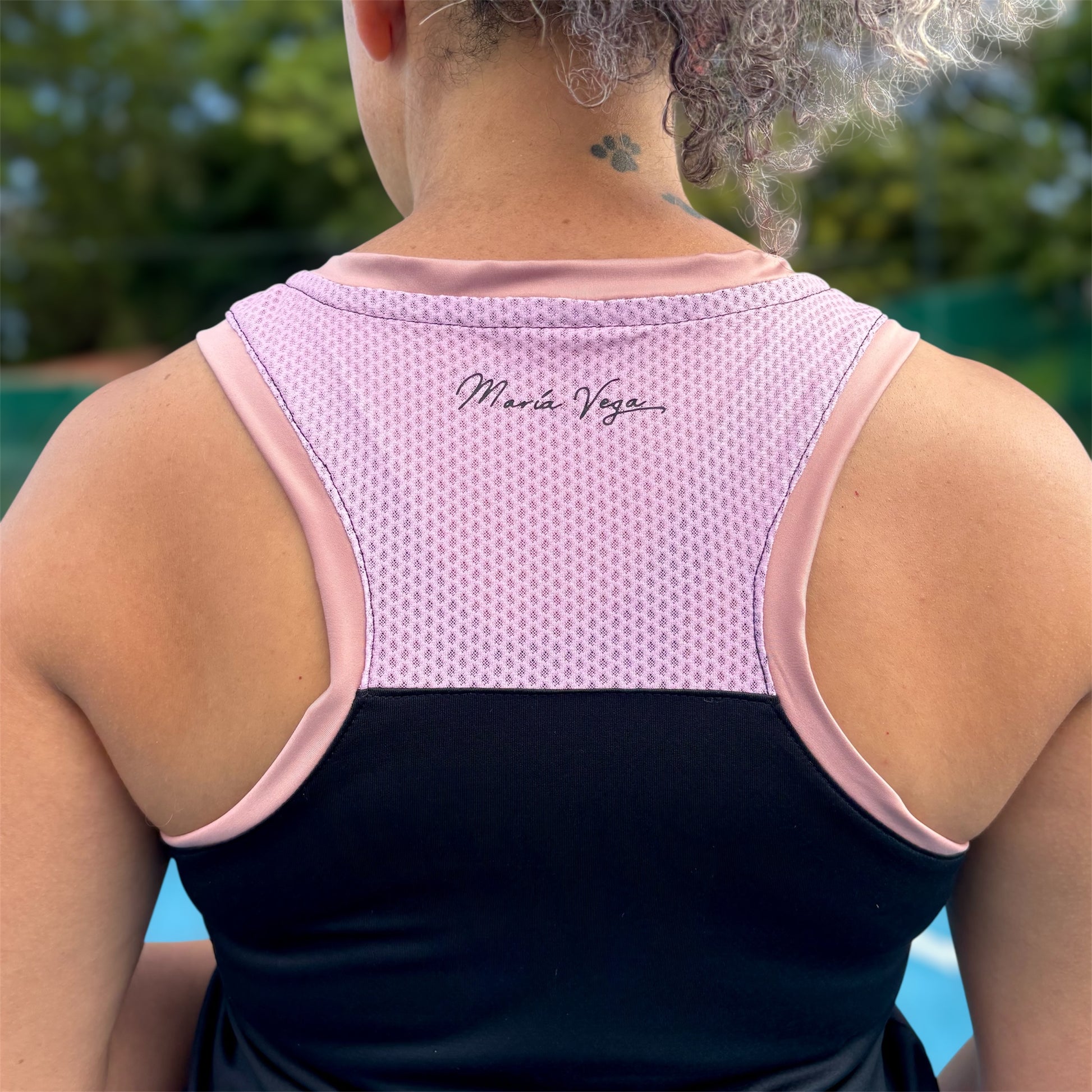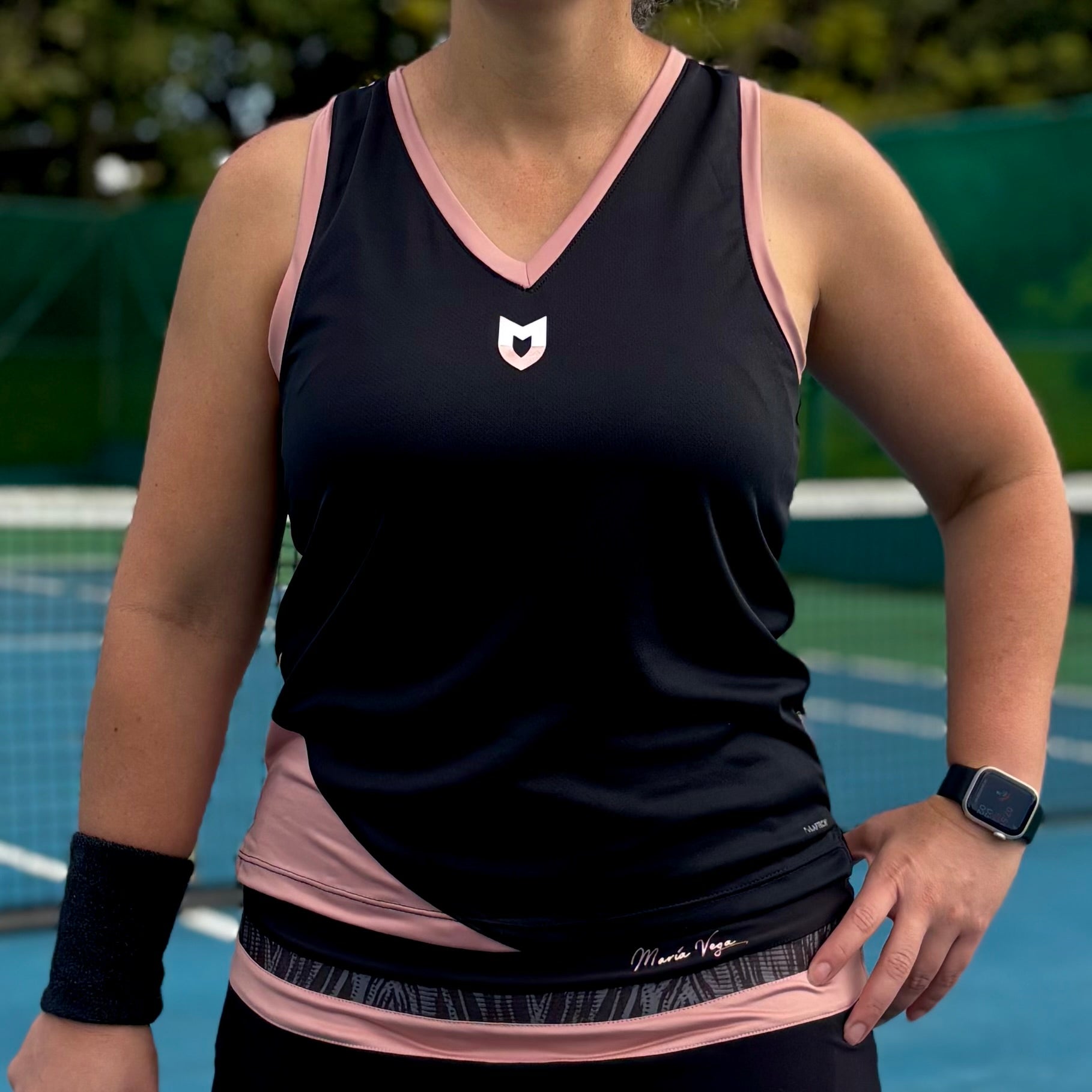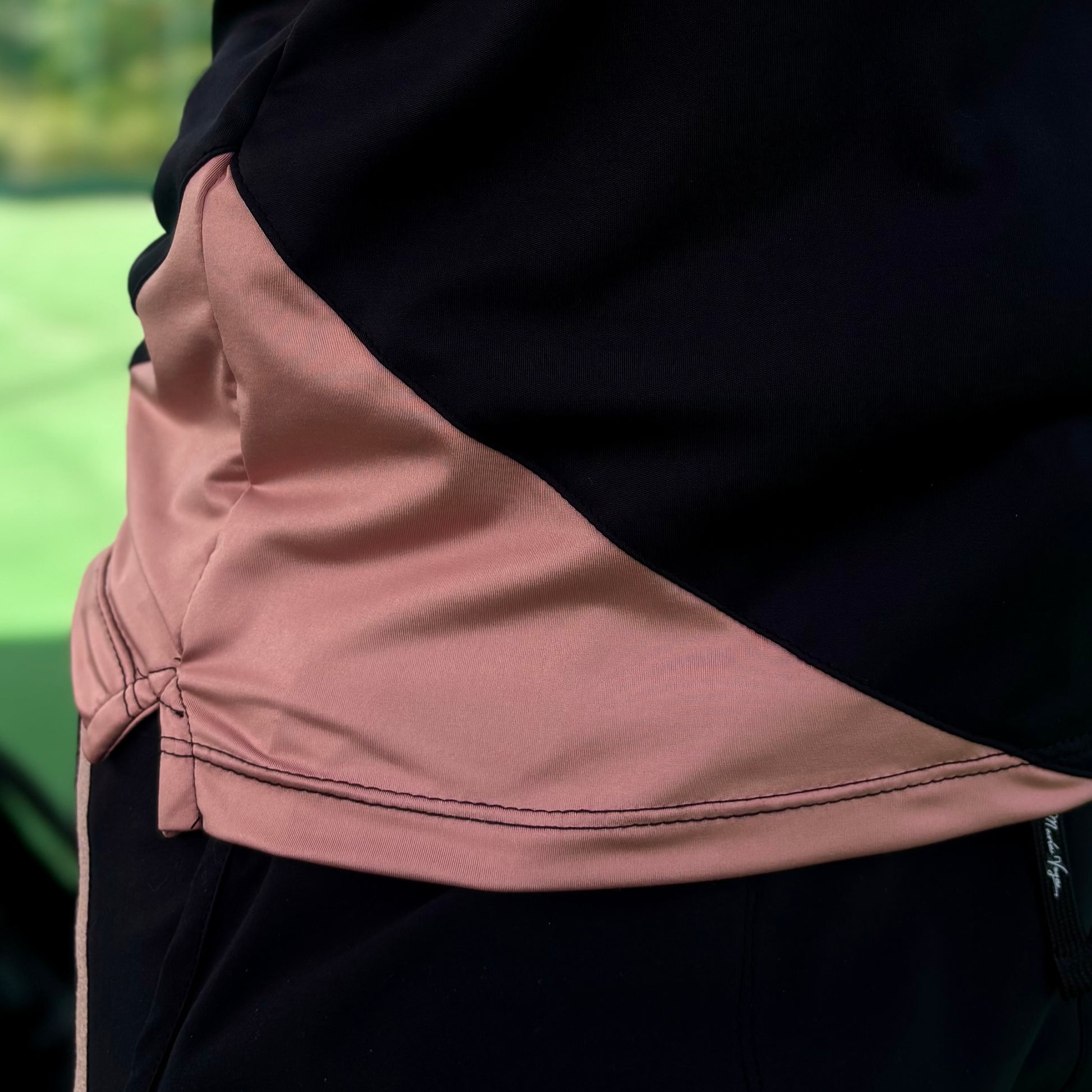Sleek and modern, this black tennis shirt features a clean V-neckline and rose colour accents that add quiet sophistication. Lightweight, breathable and moisture-wicking, it keeps you fresh through every set. With a relaxed fit and a slightly longer length, it’s designed for comfort and style — on and off court.