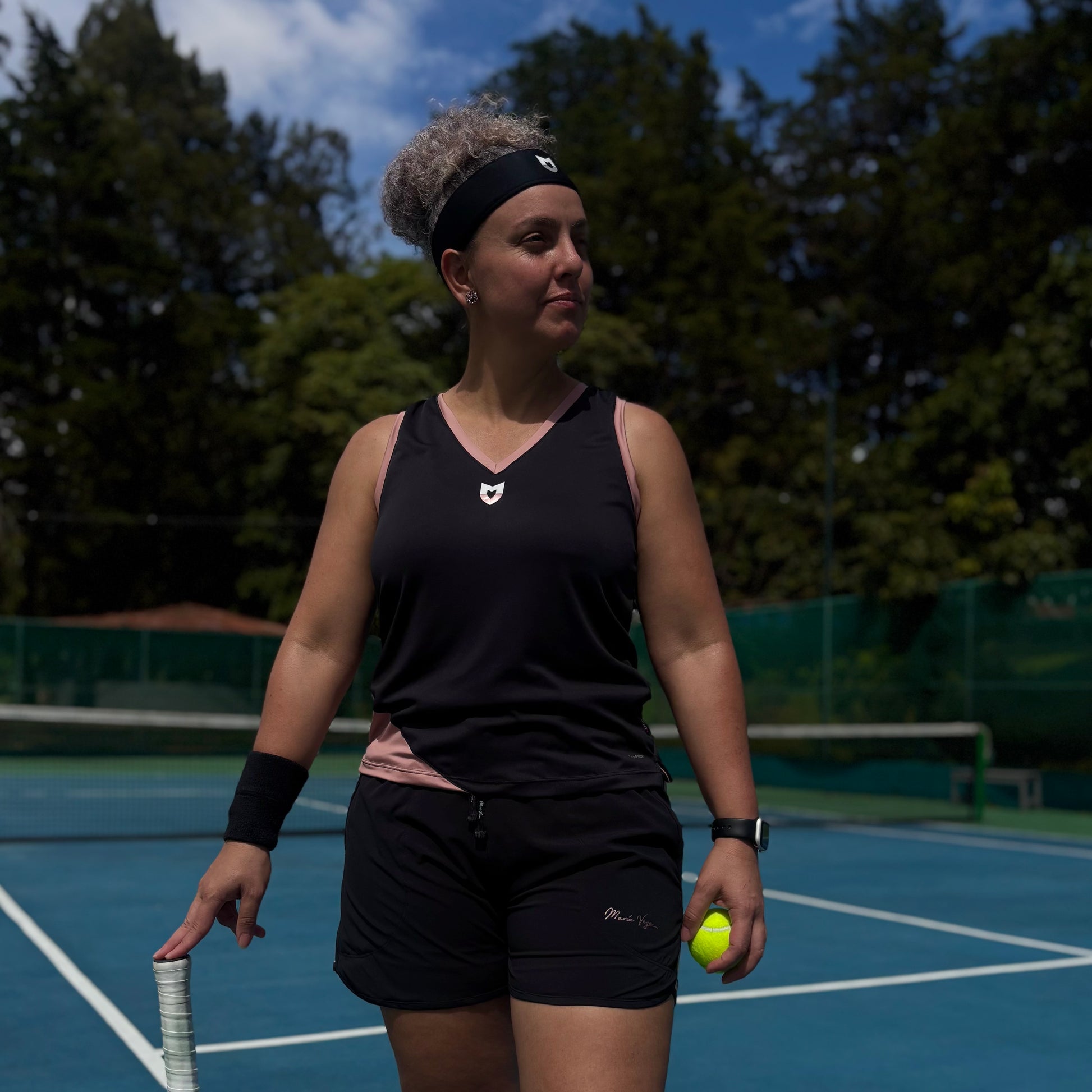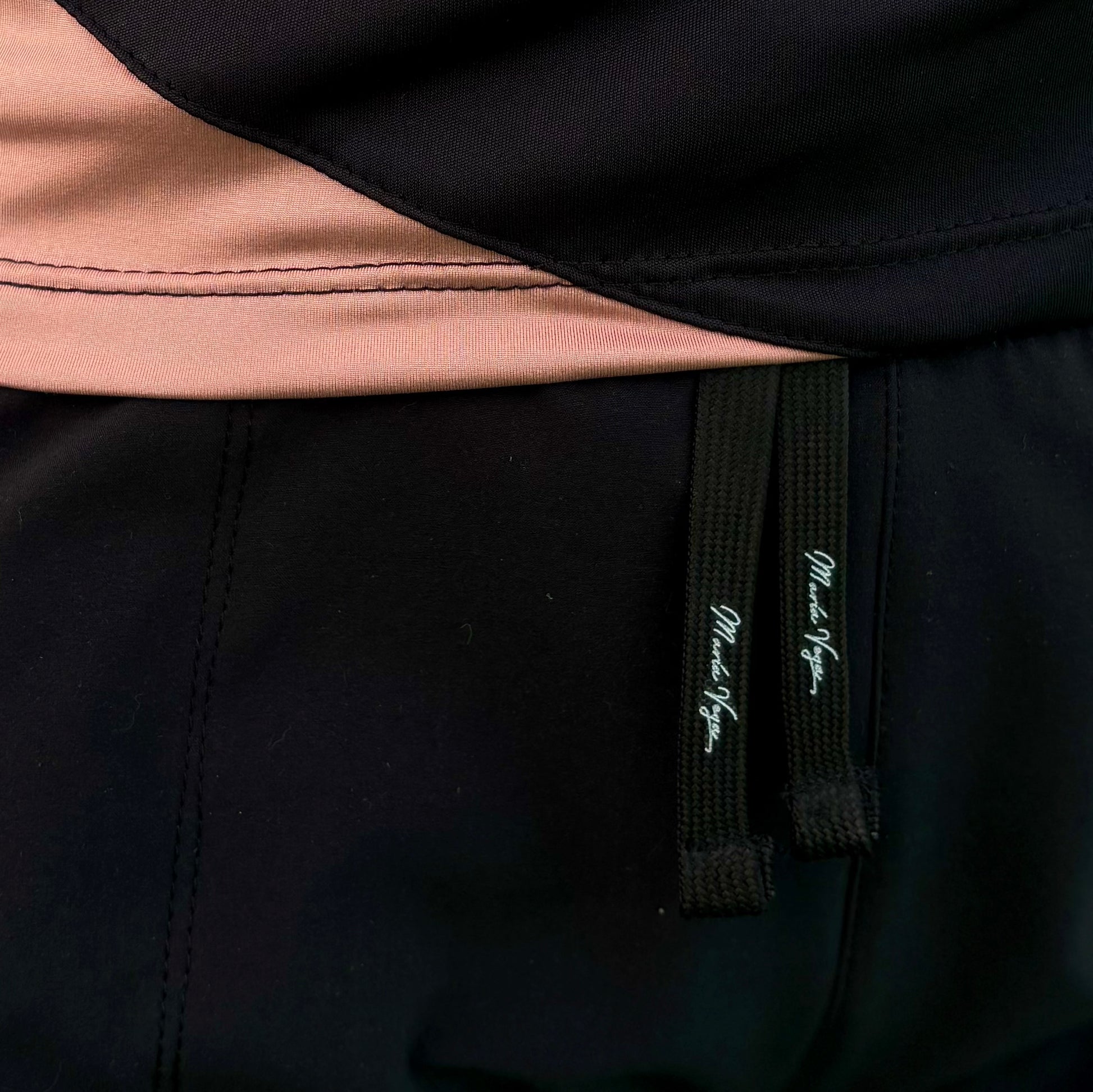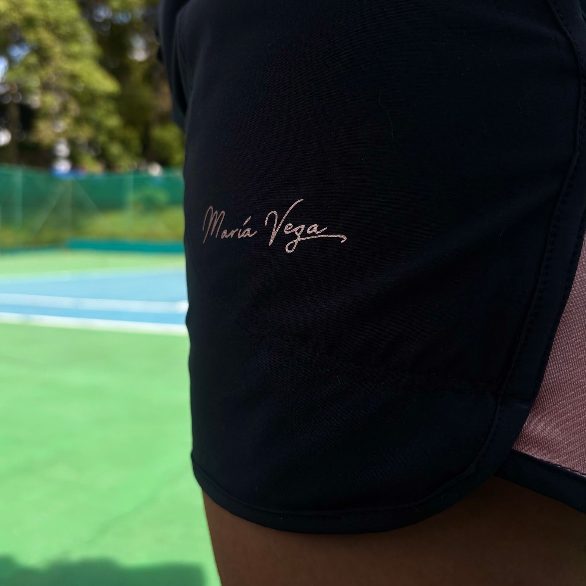 Sleek and striking, these black tennis shorts combine technical precision with effortless style. Featuring subtle grey patterned and rose side stripes, they’re designed to stand out with quiet confidence. Built-in patterned grey compression shorts offer support and coverage, while discreet side pockets add everyday functionality.